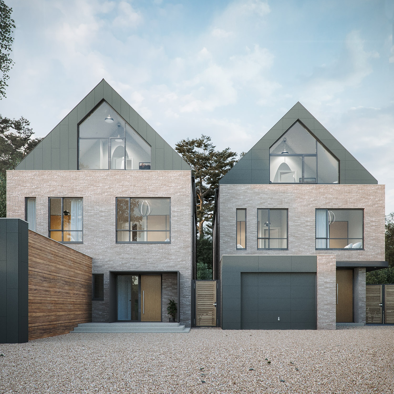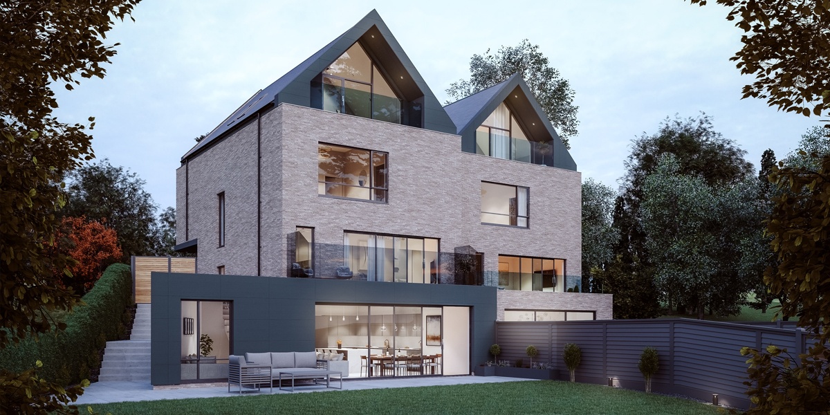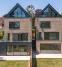 The form of the houses are relatively traditional with modern detailing. A sympathetic material palette of light-coloured brick and zinc have been selected to give the homes a fresh, contemporary feel. The houses were completed in August 2024 and were shortlisted for the UK property awards.